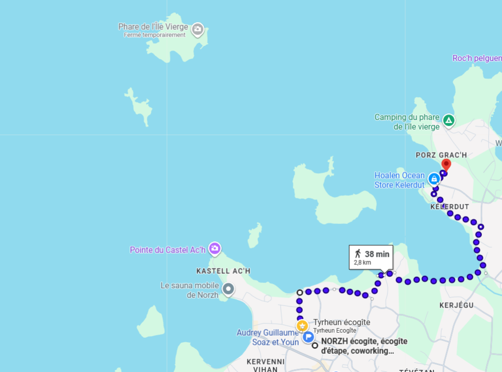 Le chemin longe la côte et offre de jolis points de vue sur la baie, l’ile vean et le phare : une promenade idéale pour prendre l’air, observer les oiseaux marins et profiter du paysage avant de passer à table.